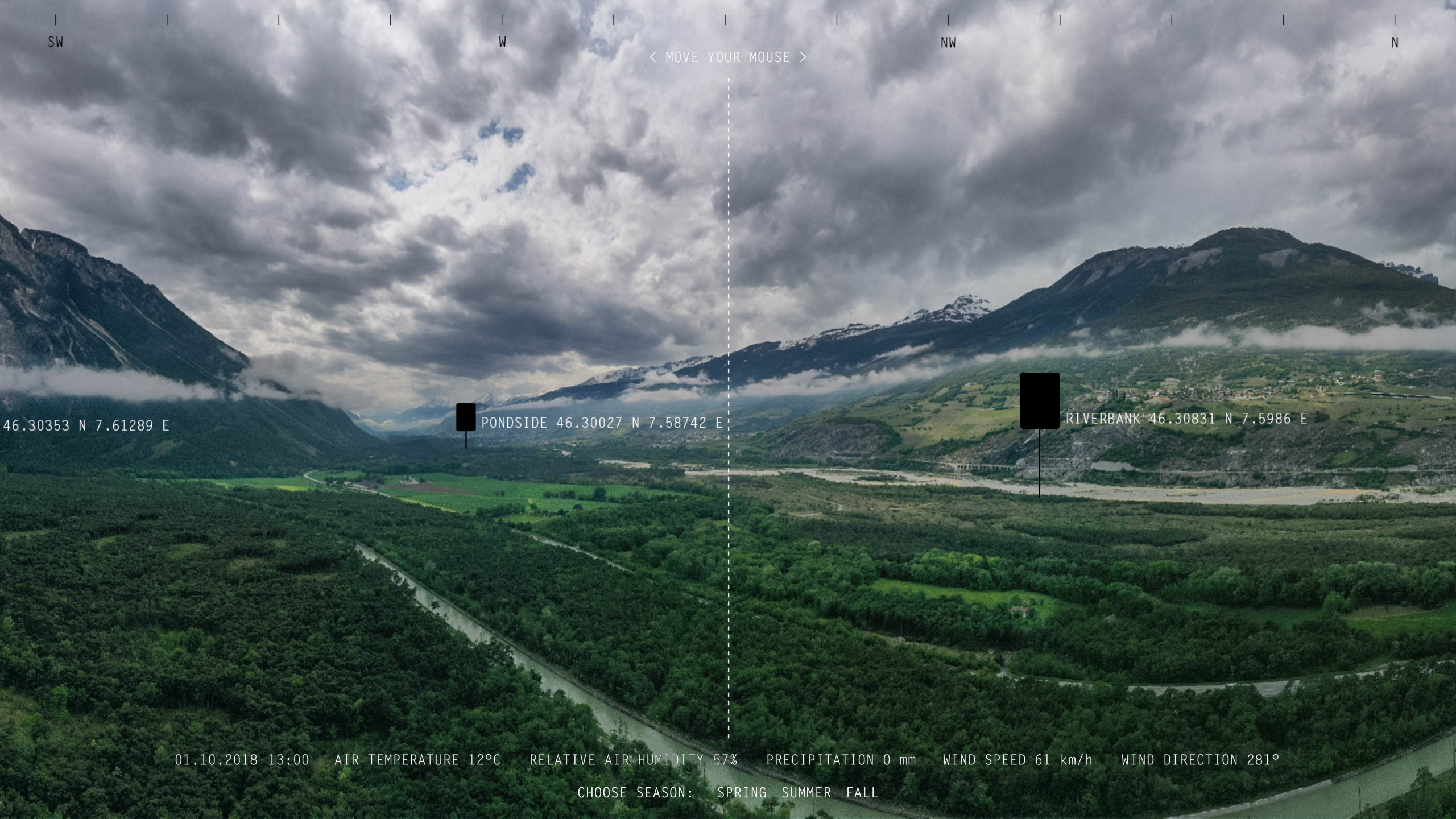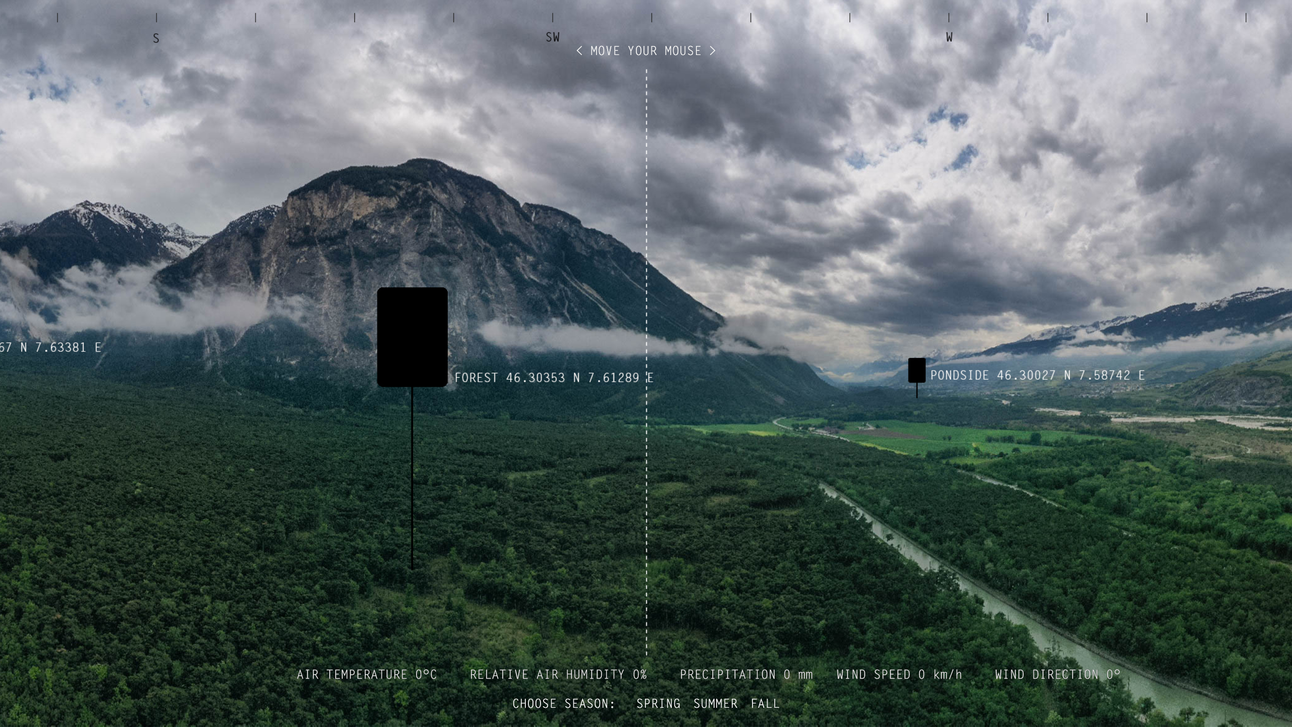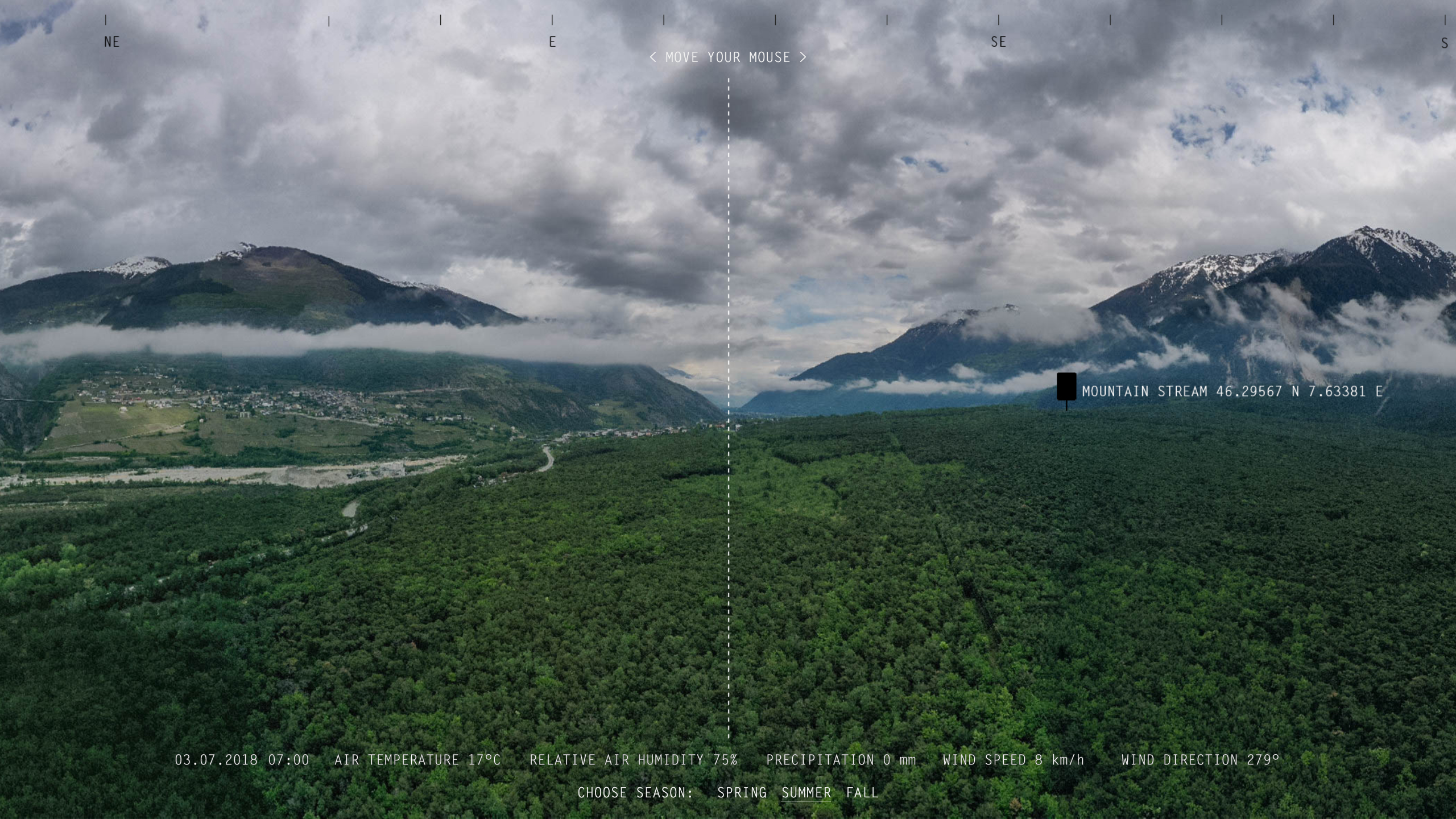 Four audio recorder placed at different locations across the Pfynwald forest in Wallis, Switzerland recorded the environmental sounds from April to October 2018. In this web version one can rotate around 360° and hear the sounds located in the panorama picture. Additionally environmental data like temperature, humidity and radiation control the synthetic sound that is is heard from the direction of the wind.